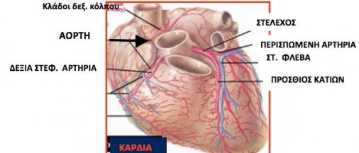 Με κόκκινο χρώμα οι στεφανιαίες αρτηρίες αρτηρίες που τροφοδοτούν με αίμα το μυοκάρδιο. Όταν συστέλλεται η αριστερή κοιλία στέλνει το αίμα στην αορτή.