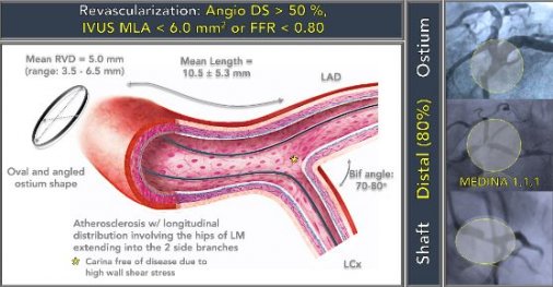 Τα κριτήρια θεραπείας της άπω νόσου στελέχους είναι είτε αγγειογραφικά (angiographic diameter stenosis < 50%) ή πιο ειδικά με τη χρησιμοποίηση ενδοστεφανιαίας απεικόνισης IVUS (MLA < 6.0 mm2) και ενδοστεφανιαίας εφεδρείας ροής (FFR < 0.80). (Fig 1).