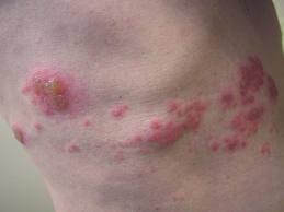 Μετά από 2-3 ημέρες, όταν πλέον ο ιός έχει ξεφύγει από τα όρια του νεύρου και έχει περάσει στο δέρμα πέριξ αυτού, εμφανίζονται το χαρακτηριστικό εξάνθημα: αρχικά ερυθρές κηλίδες πάνω στις οποίες σχηματίζονται φυσαλίδες με υγρό, οι οποίες τελικά σπάνε και δημιουργούνται εφελκίδες (κρούστα).