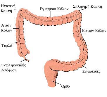 Το παχύ έντερο βρίσκεται μέσα στην κοιλιακή χώρα και κρέμεται από μια «μεμβράνη» λίπους το μεσόκολο το οποίο περιέχει το λίπος, τα αγγεία (αρτηρίες, φλέβες) και τους λεμφαδένες (αδένες μεγέθους λίγων χιλιοστών οι οποίοι υπεύθυνοι για την άμυνα του οργανισμού). Είναι επίσης σημαντικό να γνωρίζουμε ότι το κόλον χωρίζεται σε τμήματα και κάθε ένα από αυτά έχει αντίστοιχη περιοχή στο μεσόκολο. Τα τμήματα του παχέος εντέρου είναι το ανιόν (δεξιό) κόλον, εγκάρσιο, κατιόν (αριστερό) και σιγμοειδές κόλον.