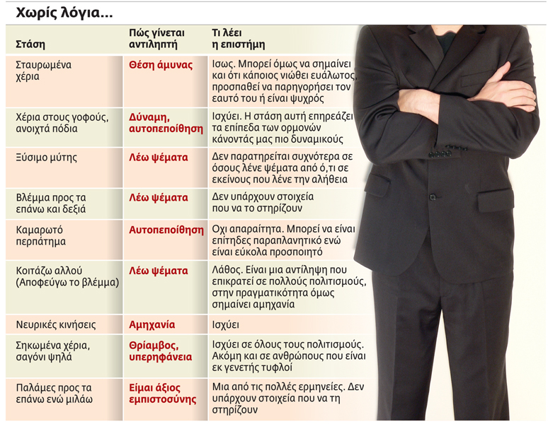 Οι κινήσεις και οι στάσεις του σώματός μας περνάνε συχνά ένα μήνυμα στους γύρω μας και φαίνεται πως αυτό το μήνυμα δεν μπορούμε να το ελέγξουμε απόλυτα. Υπάρχουν λοιπόν αρκετά σημάδια που προδίδουν κάποιον όταν δεν λέει την αλήθεια. Κάθε φορά που κάνετε μια ερώτηση, παρατηρήστε την απάντηση στη γλώσσα του σώματος. Αν εντοπίσετε μια ακούσια κίνηση των χεριών προς το πρόσωπο, το λαιμό, τα μαλλιά ή το λοβό του αυτιού, είναι πολύ πιθανό αυτό που σας λένε να μην είναι απόλυτα αληθές. Άλλη μια ένδειξη είναι όταν το βλέμμα του συνομιλητή σας ξαφνικά καρφώνεται στο ταβάνι ή στο πάτωμα.