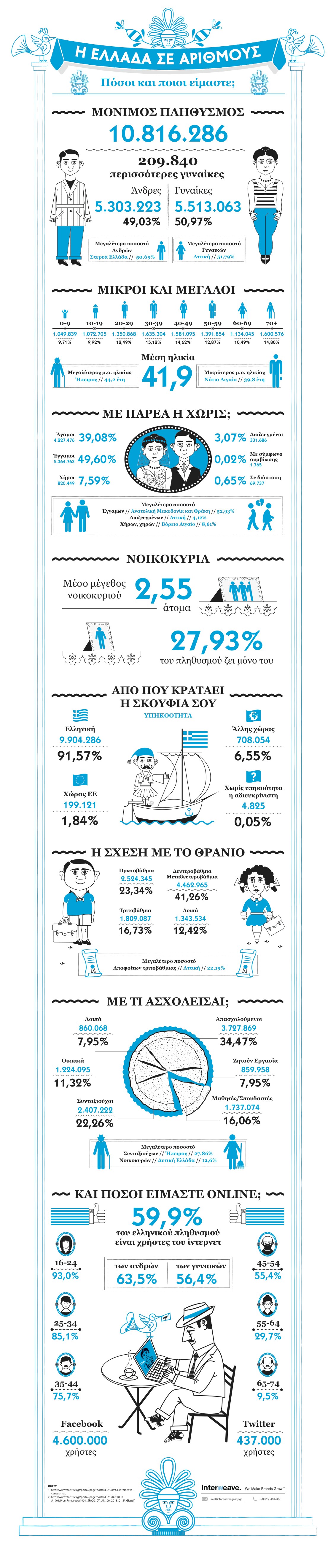 Περισσότερες γυναίκες ή άνδρες; Μικροί ή μεγάλοι; Πόσοι οι παντρεμένοι; Πόσοι online; Αυτές και άλλες ερωτήσεις έρχεται να απαντήσει το παρακάτω infographic που δείχνει ενδιαφέροντα στατιστικά από την απογραφή του 2011.