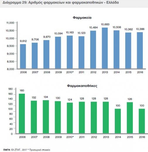 Στην Ελλάδα το 2016 λειτούργησαν 10.386 φαρμακεία, εκ των οποίων τα 3.736 (36%) είχαν έδρα στην Αττική. Ο αριθμός των φαρμακαποθηκών μειώθηκε από 126 το 2015 σε 100 το 2016.