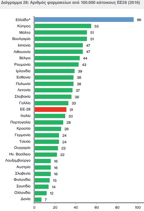 ΕΕ28, καθώς αντιστοιχούν 96 φαρμακεία ανά 100 000 κατοίκους για το 2016, όταν ο αντίστοιχος μέσος όρος στην ΕΕ28 είναι 31 φαρμακεία ανά 100.000 κατοίκους.
