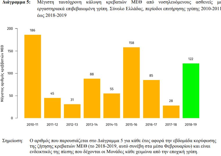 Κατά τη φετινή περίοδο 2018-2019, υπήρξε ένα µέγιστο 122 ασθενών µε εργαστηριακά επιβεβαιωµένη γρίπη που παρέµειναν ταυτόχρονα νοσηλευόµενοι στις ΜΕΘ όλης της χώρας και συγκεκριµένα αυτό συνέβη στα µέσα Φεβρουαρίου 2019.