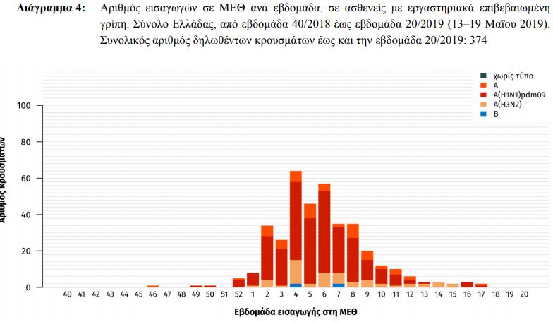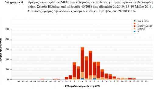 Κατά την περίοδο από εβδοµάδα 40 του 2018 έως εβδοµάδα 20 του 2019), στην Ελλάδα καταγράφηκαν 388 σοβαρά κρούσµατα εργαστηριακά επιβεβαιωµένης γρίπης, εκ των οποίων τα 374 νοσηλεύτηκαν σε ΜΕΘ.