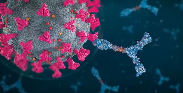Καλλιτεχνική απεικόνιση αντισωμάτων που επιτίθενται στις πρωτεΐνες ακίδας του κορωνοϊού.