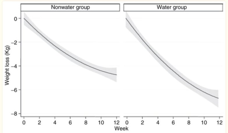 H διαφορά απώλειας βάρους μεταξύ της ομάδας που δεν έγινε νερό και της ομάδας που έπινε 500 ml νερό πριν από τα τρία γεύματα της ημέρας.