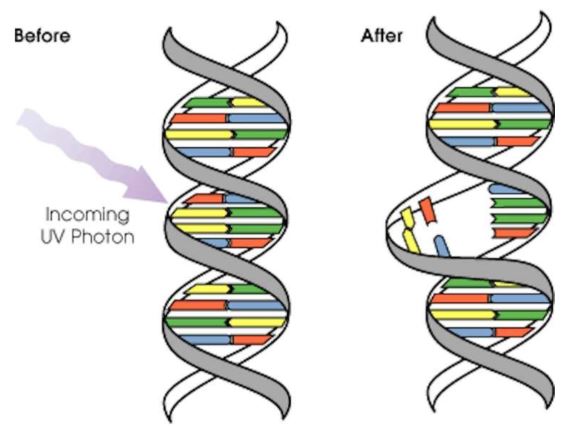 Η ζημιά στο DNA προκαλείται κυρίως από την UVB που έχει την υψηλότερη ενέργεια. Ουσίες που ονομάζονται φωτοπροϊόντα -επειδή είναι αποτέλεσμα της ηλιακής ακτινοβολίας- παράγονται στο μόριο του DNA, προκαλώντας μικρές παραμορφώσεις στη δομή του. Το DNA υπάρχει σε κάθε κύτταρο, εκτός από τα ερυθρά αιμοσφαίρια και το στρώμα των νεκρών κυττάρων στην επιφάνεια του δέρματος. Αν περάσετε μια μέρα κάτω από τον ήλιο μπορεί να προκληθούν ακόμα και 100.000 ξεχωριστές βλάβες στο DNA κάθε εκτεθειμένου κυττάρου σας. Αυτές οι βλάβες μπορεί να κάνουν τις βάσεις του DNA να συνδεθούν με λάθος τρόπο. Καθώς η έλικα του DNA παραμορφώνεται, μπορεί να μην αντιγραφεί σωστά όταν έρθει η ώρα της διαίρεσης του κυττάρου.