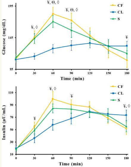 Πολλοί είχαν απότομη αύξηση της γλυκόζης μετά την κατανάλωση ρυζιού ή σταφυλιών, ανεξάρτητα από την μεταβολική τους υγεία. Οι υψηλότερες αυξήσεις ήταν μετά την κατανάλωση ζυμαρικών ή πατάτας και εμφανίστηκαν σε αυτούς που είχαν αντίσταση στην ινσουλίνη ή δυσλειτουργία των βήτα κυττάρων. Οι ερευνητές εξέτασαν εάν η κατανάλωση μιας μερίδας φυτικών ινών, πρωτεΐνης ή λίπους πριν από τους υδατάνθρακες μείωνε τις αιχμές του σακχάρου. Για το τεστ αυτό, οι συμμετέχοντες έτρωγαν σκόνη φυτικών ινών μπιζελιού, πρωτεΐνη από βραστά ασπράδια αυγών ή λίπος 10 λεπτά πριν την κατανάλωση ρυζιού. Οι αιχμές μειώθηκαν, αλλά μόνο στους μεταβολικά υγιείς που ήταν ευαίσθητοι στην ινσουλίνη ή είχαν φυσιολογική λειτουργία των βήτα κυττάρων. Η κατανάλωση λίπους, πρωτεΐνης ή φυτικών ινών πριν από τους υδατάνθρακες είχε ελάχιστη επίδραση στην απόκριση της γλυκόζης στα άτομα με αντίσταση στην ινσουλίνη ή δυσλειτουργία των βήτα κυττάρων.