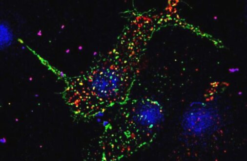 Ένα βήτα κύτταρο παγκρέατος που δείχνει σημεία με τη μορφή μεταφορέων GLUT σε πράσινο και κόκκων ινσουλίνης σε κόκκινο, τον πυρήνα του κυττάρου σε μπλε, ληφθείσα σε υπερ-ανάλυση με Zeiss-Elyra. Πίστωση: Anuma Pallavi.