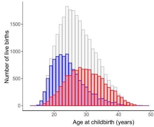 Όλες οι γεννήσεις (n = 25.801) δίνονται ως γκρι μπάρες, οι μπλε μπάρες αντιπροσωπεύουν μόνο τις πρώτες γεννήσεις (n = 10.688) και οι κόκκινες μπάρες υποδεικνύουν τις τελευταίες γεννήσεις (n = 10.688).