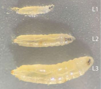 Τα τρία προνυμφικά στάδια ανάπτυξης (ή «instars») της Drosophila melanogaster: L1 έως L3, με το L3 να είναι το στάδιο στο οποίο επικεντρώθηκε η μελέτη. Η προνύμφη L3 έχει μήκος περίπου 5 χιλιοστά.