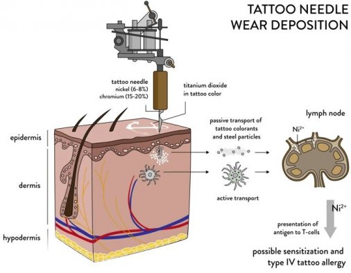 Αυτά τα σωματίδια -που προέρχονται από τις βελόνες που χρησιμοποιούνται για τη διάτρηση του δέρματός σας και την απόθεση του μελανιού- περιλαμβάνουν νικέλιο και χρώμιο, τα οποία είναι αλλεργιογόνα. Έτσι θα μπορούσαν να προκαλέσουν αλλεργικές αντιδράσεις που αποδίδονται μέχρι τώρα μόνο στα μελάνια.