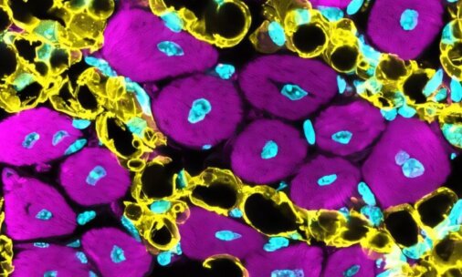 Η διήθηση ενδομυϊκού λίπους αποτελεί καθοριστικό παράγοντα για την υγεία και τη λειτουργία του σκελετικού μυός στην περιφερική αρτηριακή νόσο. Κίτρινο: λιπώδη κύτταρα· μωβ: σκελετικός μυς. Πηγή: Daniel Kopinke.
